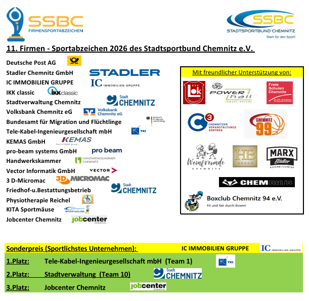 Der 1. Platz 2026 ging an das Tele-Kabel-Ingenieurgesellschaft mbH (Team 1), der Sonderpreis „Sportlichstes Unternehmen“ der Stadt Chemnitz an die IC IMMOBILIEN GRUPPE.