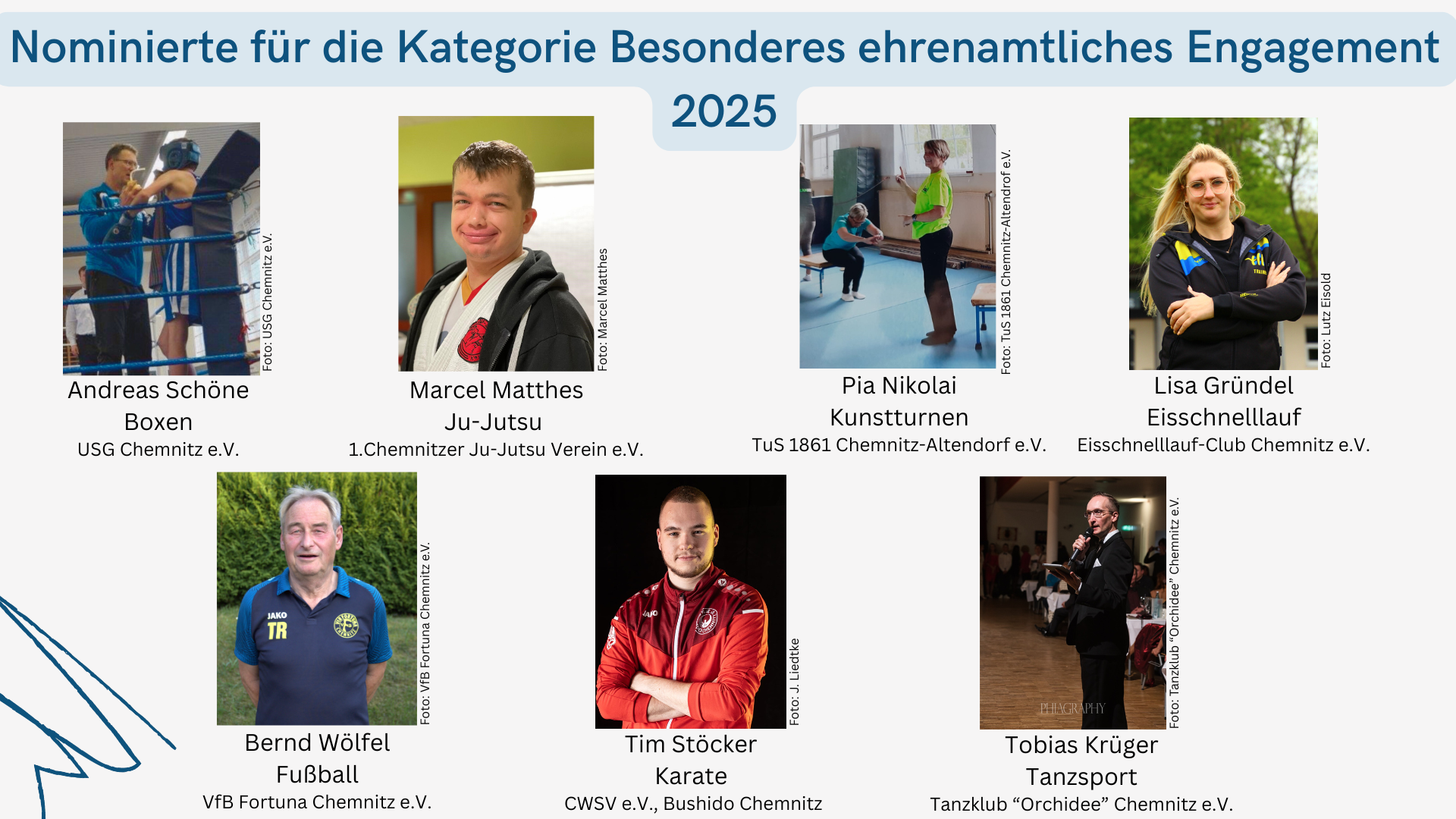 Am Veranstaltungsabend werden jeweils drei Preisträger:innen pro Kategorie gleichrangig ausgezeichnet. Außerdem ehrt der Olympiastützpunkt Sachsen an diesem Abend gemeinsam mit der Stadt Chemnitz besonders erfolgreiche Nachwuchssportler:innen in der Kategorie Beste Internationale Leistung für ihre Platzierung (Platz 1 bis 6) bei Jugend-Europa- oder Jugend-Weltmeisterschaften, bei Youth Olympic Games/ Olympischen Jugendspielen (YOG) und bei European Youth Olympic Festival/Europäischen Jugendspielen (EYOF) im Jahr 2025.